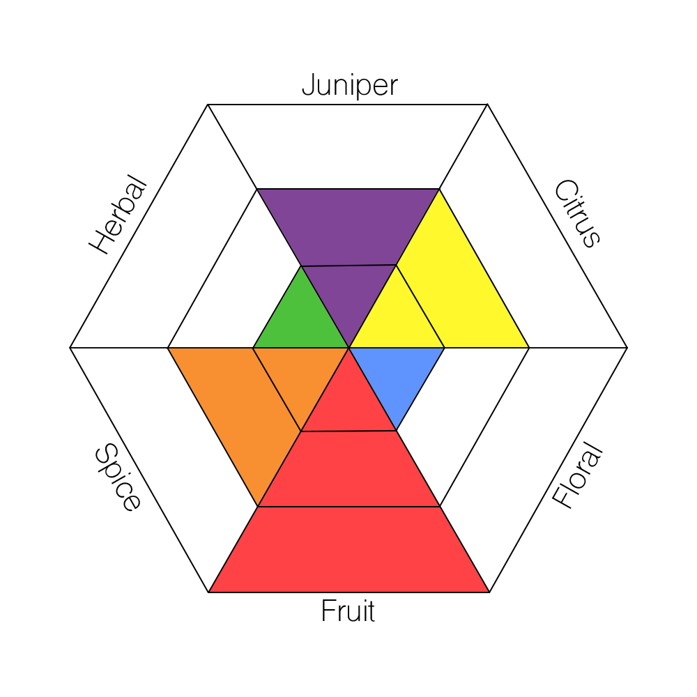 The main taste profiles in gin are: Juniper, Citrus, Floral, Fruit, Spice, and Herbal.