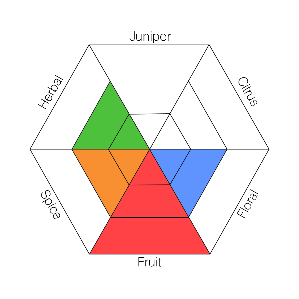 The main taste profiles in gin are: Juniper, Citrus, Floral, Fruit, Spice, and Herbal.