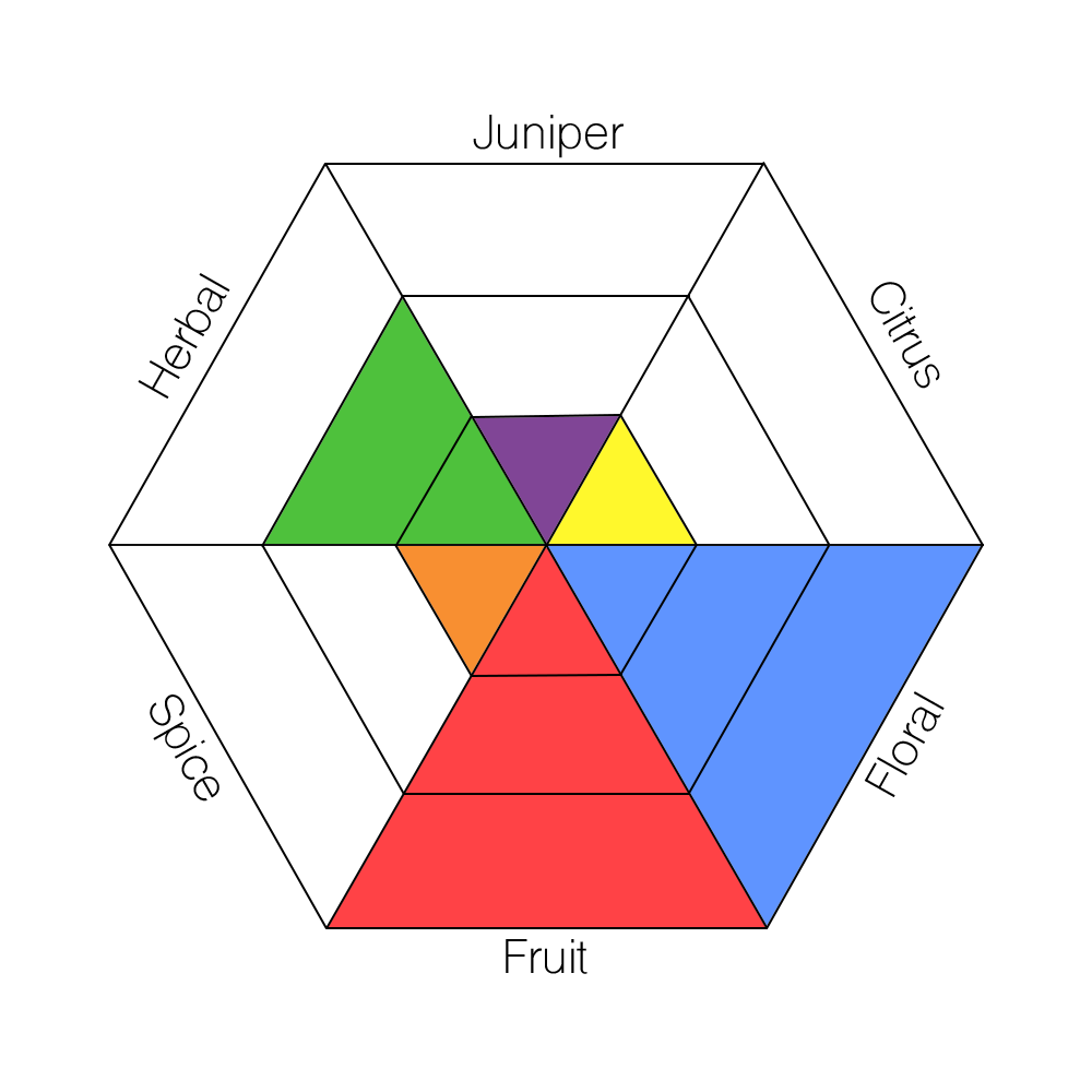 The main taste profiles in gin are: Juniper, Citrus, Floral, Fruit, Spice, and Herbal.