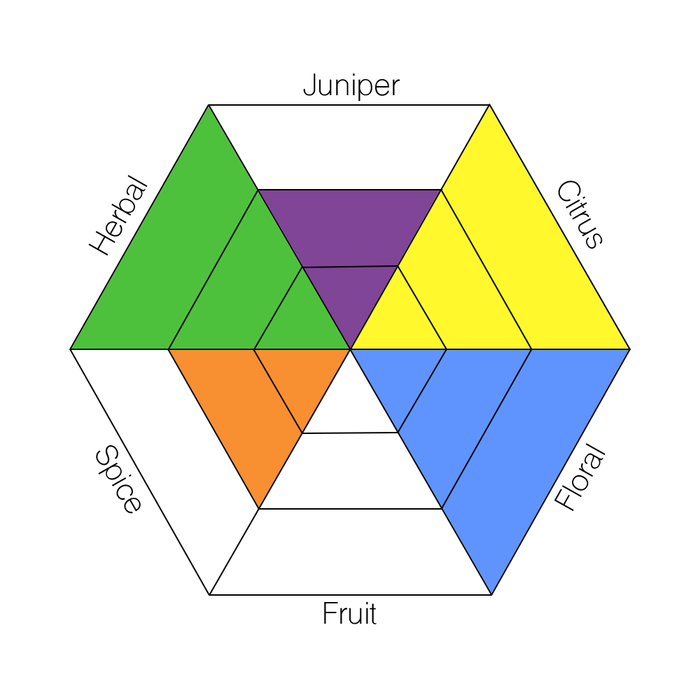 The main taste profiles in gin are: Juniper, Citrus, Floral, Fruit, Spice, and Herbal.