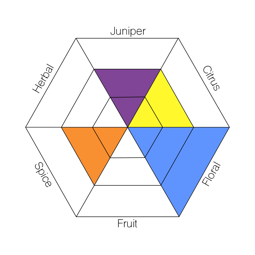 The main taste profiles in gin are: Juniper, Citrus, Floral, Fruit, Spice, and Herbal.
