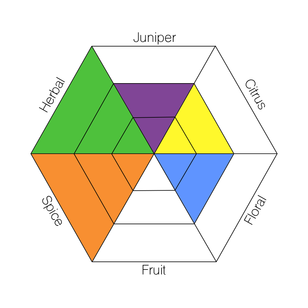 The main taste profiles in gin are: Juniper, Citrus, Floral, Fruit, Spice, and Herbal.