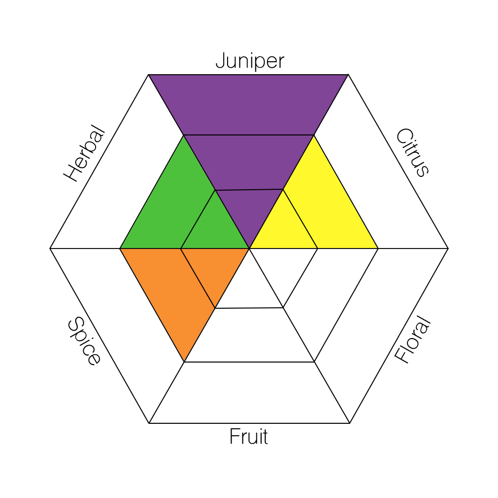 The main taste profiles in gin are: Juniper, Citrus, Floral, Fruit, Spice, and Herbal.