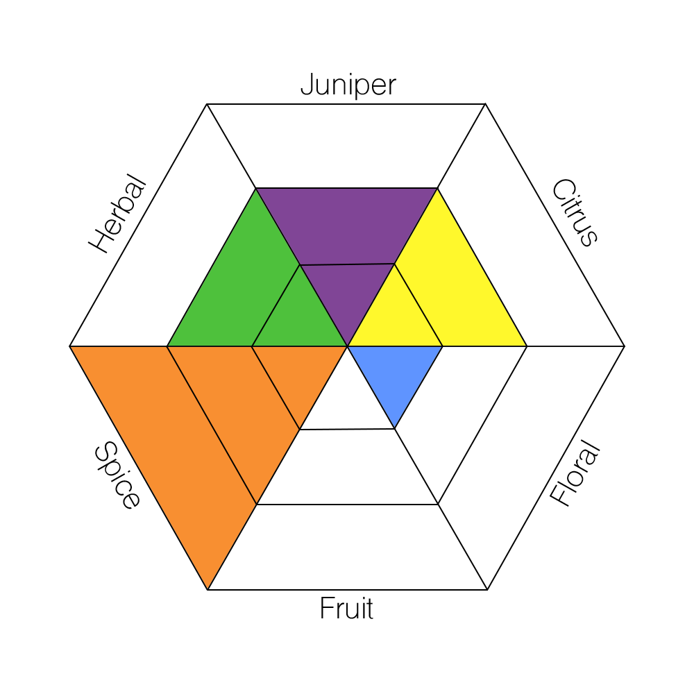 The main taste profiles in gin are: Juniper, Citrus, Floral, Fruit, Spice, and Herbal.