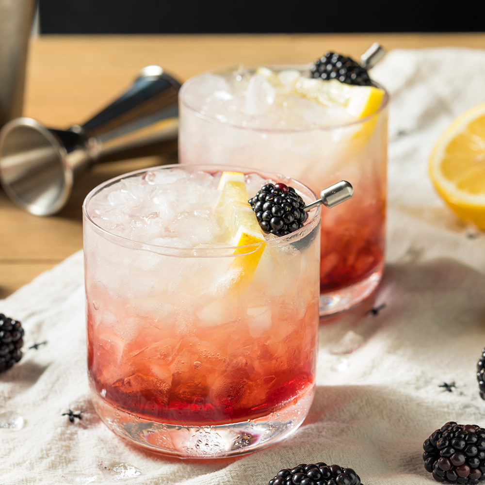 - Pour the lemon juice, gin, and simple syrup into a shaker with ice along with a handful of blackberries and shake until well chilled