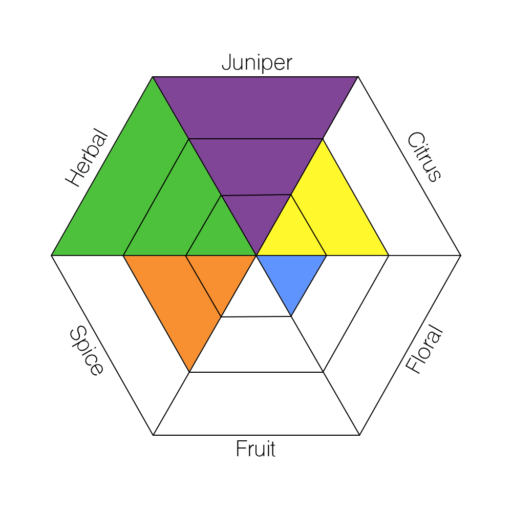 The main taste profiles in gin are: Juniper, Citrus, Floral, Fruit, Spice, and Herbal.