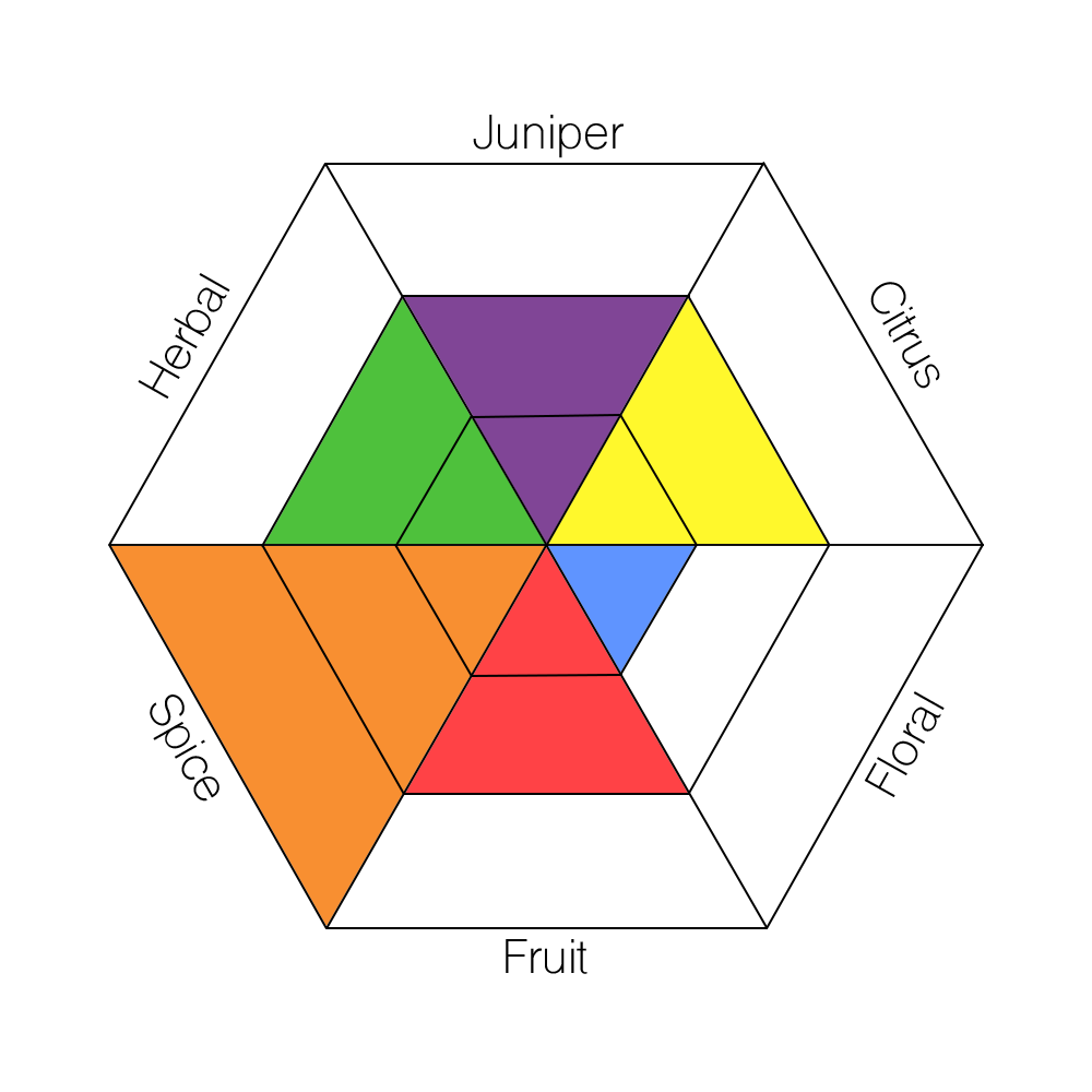 The main taste profiles in gin are: Juniper, Citrus, Floral, Fruit, Spice, and Herbal.