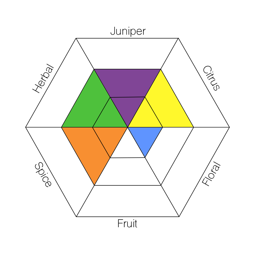 The main taste profiles in gin are: Juniper, Citrus, Floral, Fruit, Spice, and Herbal.