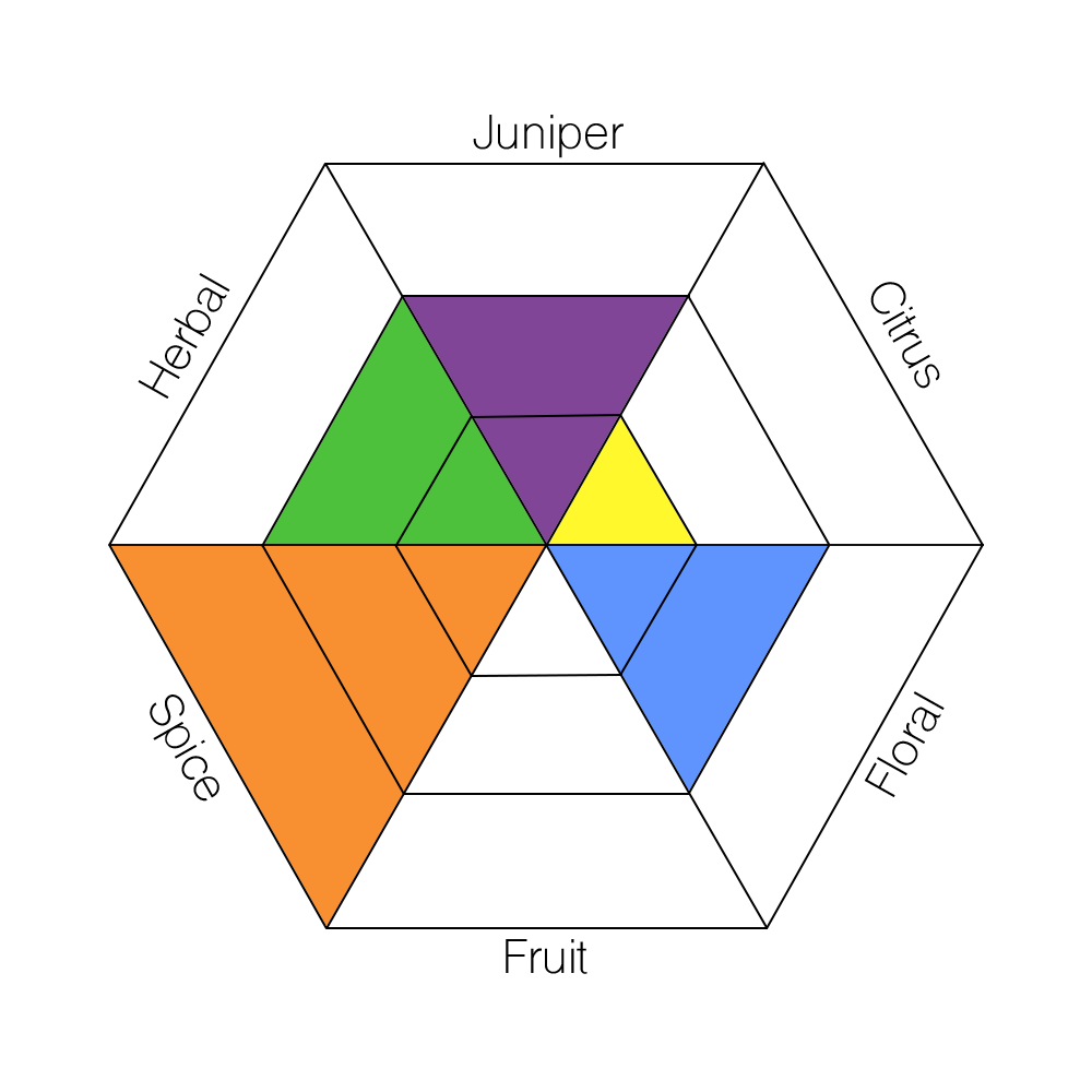 The main taste profiles in gin are: Juniper, Citrus, Floral, Fruit, Spice, and Herbal.