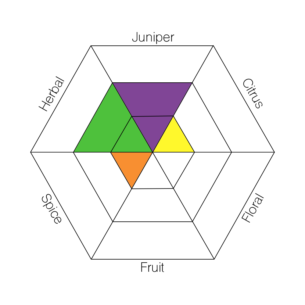 The main taste profiles in gin are: Juniper, Citrus, Floral, Fruit, Spice, and Herbal.
