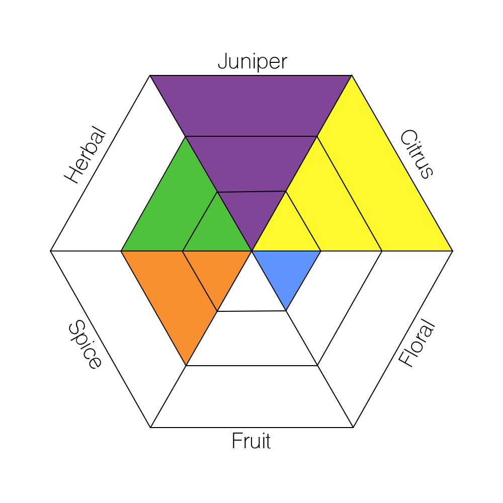 The main taste profiles in gin are: Juniper, Citrus, Floral, Fruit, Spice, and Herbal.